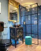 We were asked to design an annex for a client who incorporated a gym, a bathroom and a bedroom with kitchenette. The client had a wallpaper sample she loved so we designed the space around that with a firm, ‘Annabel’s’ brief. The client was very receptive to the black loo and chinoiserie sink cabinet and we used dark colours to add glamour. The bedroom was a more sophisticated proposition with more muted colours but we carried the green up from the bathroom to add continuity. It’s great working with smaller spaces – you have to be more imaginative with your planning and cohesion. Glamour on!